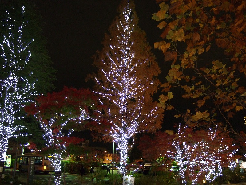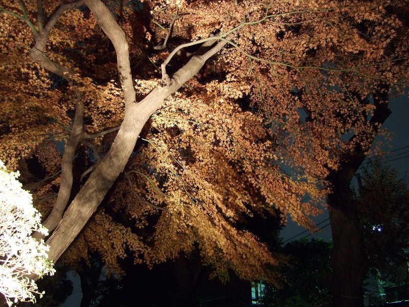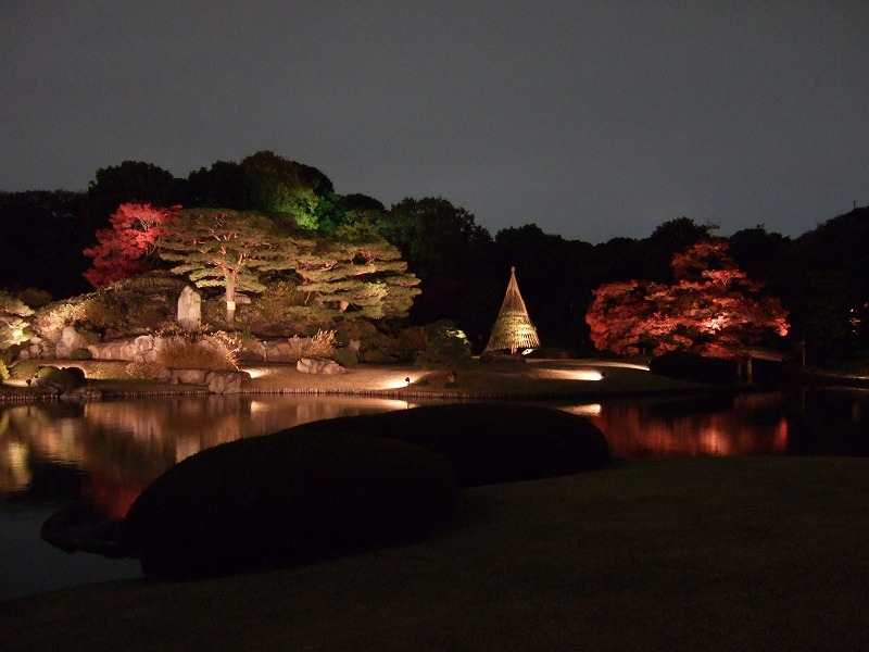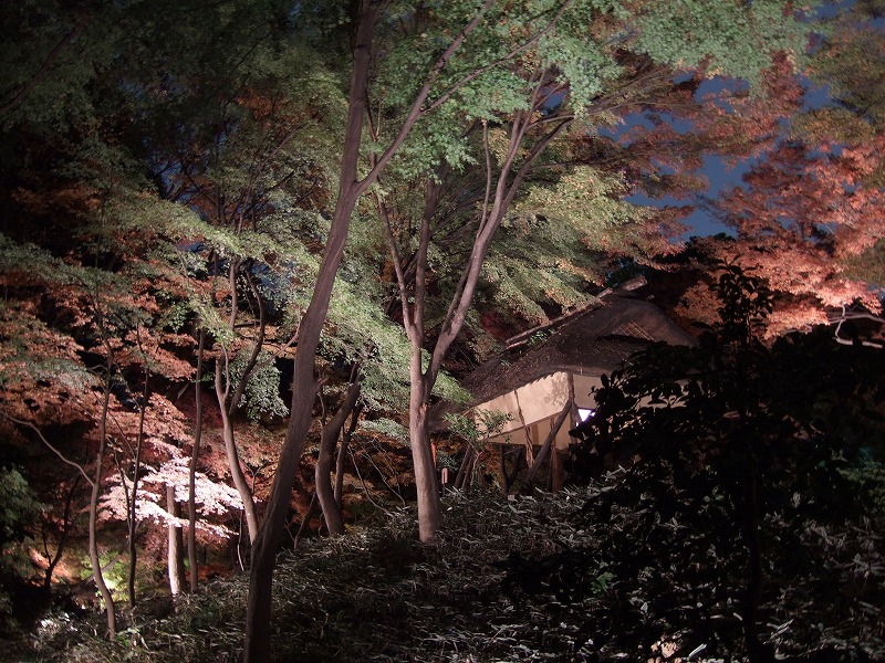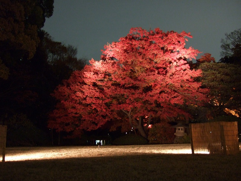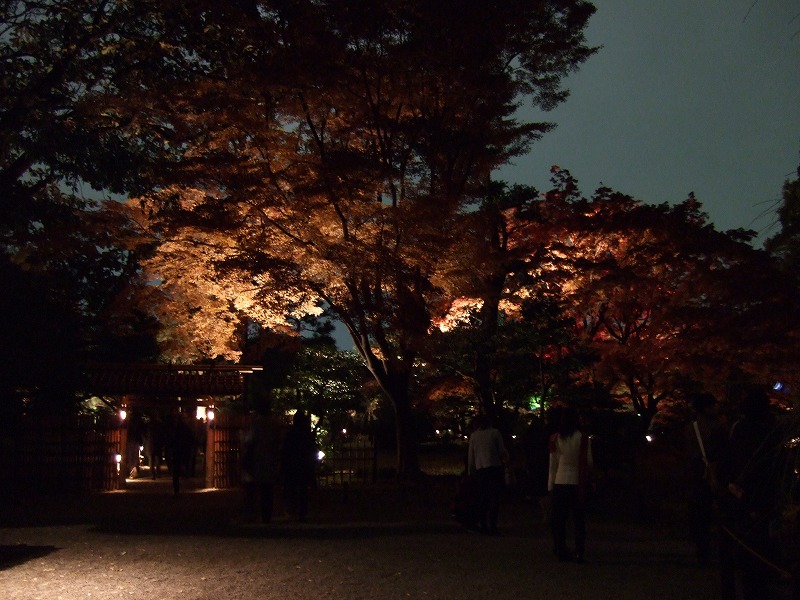 正直言って色つき加減とかは、今年の気候の影響もあってさほどではないのですが、広大なよく手入れされた日本庭園の中のもみじやイチョウが、かなり凝った照明設備でライトアップされているのでそれがたまらなくよかったです。もう写真を撮っているうしろで「ああ」とか「うう」とか感嘆符がたくさん聞こえてくるのはあまりない経験でしたね。(笑)とても23区内にいるとは思えない感じがします。良くある報道ステーションの桜や紅葉の生中継をそのまま生で見ている感じです。茶屋のオープンスペースまでおそらくハロゲン球が使われており、照明デザイナーのこだわりを感じさせられました。普通なら現場ライトでもいいんでしょうが、その辺の投資はじゃぶじゃぶやってくれています。