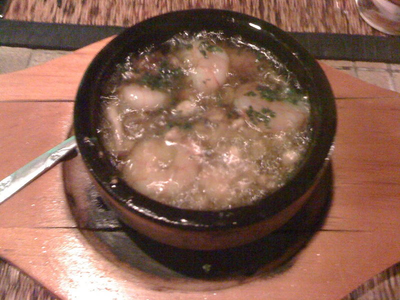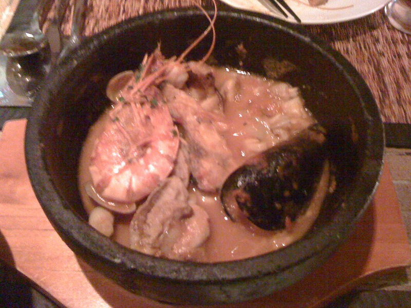 最初に来たのが、小さな石鍋にガーリックオイルがたっぷり入っていてその中に大きなえびとか海鮮ネタが入っている料理。最初油がしつこいかなと思ったけど、さらっとしていて海鮮ネタに適度にからんで非常においしい。油もガーリックの香りがして食欲をそそる。